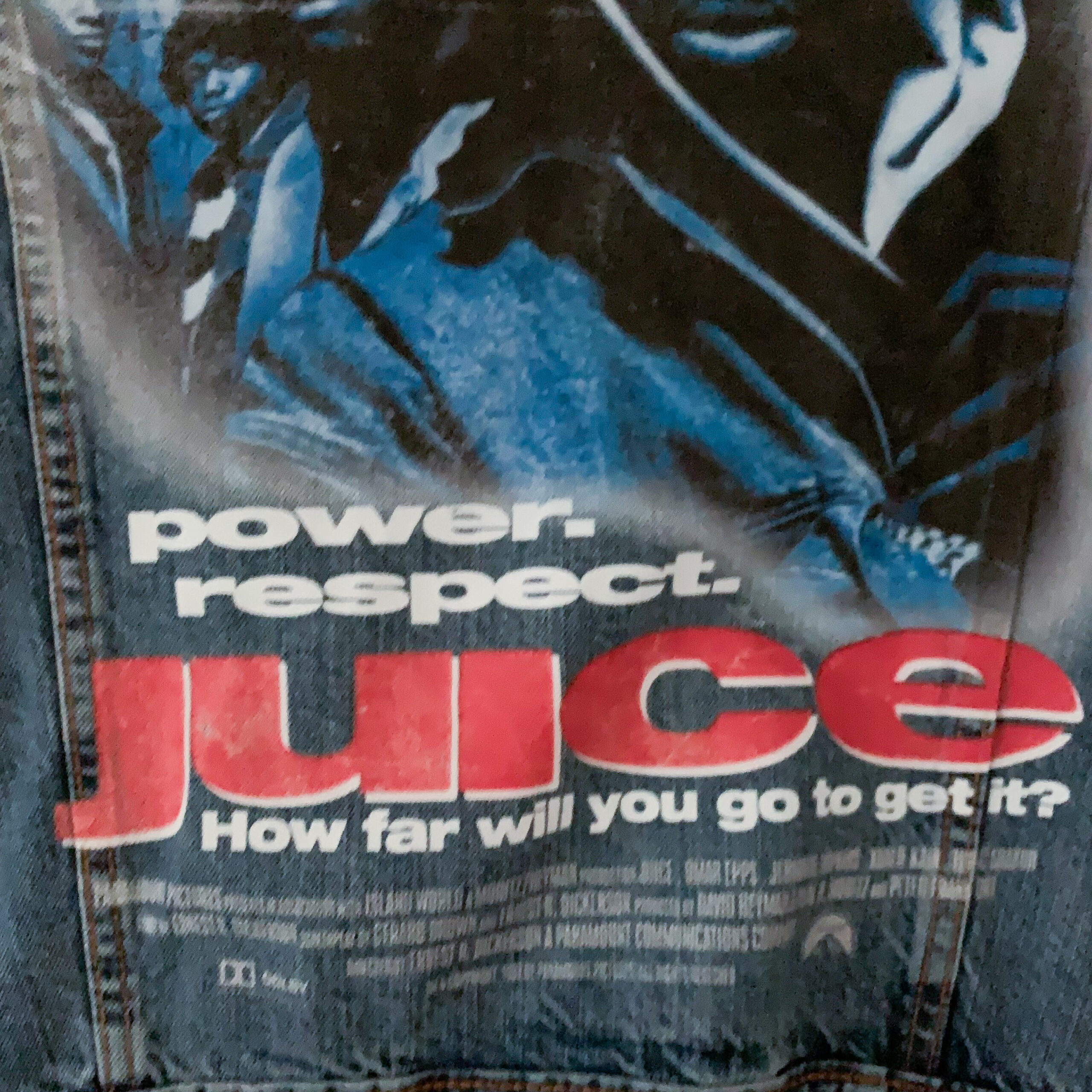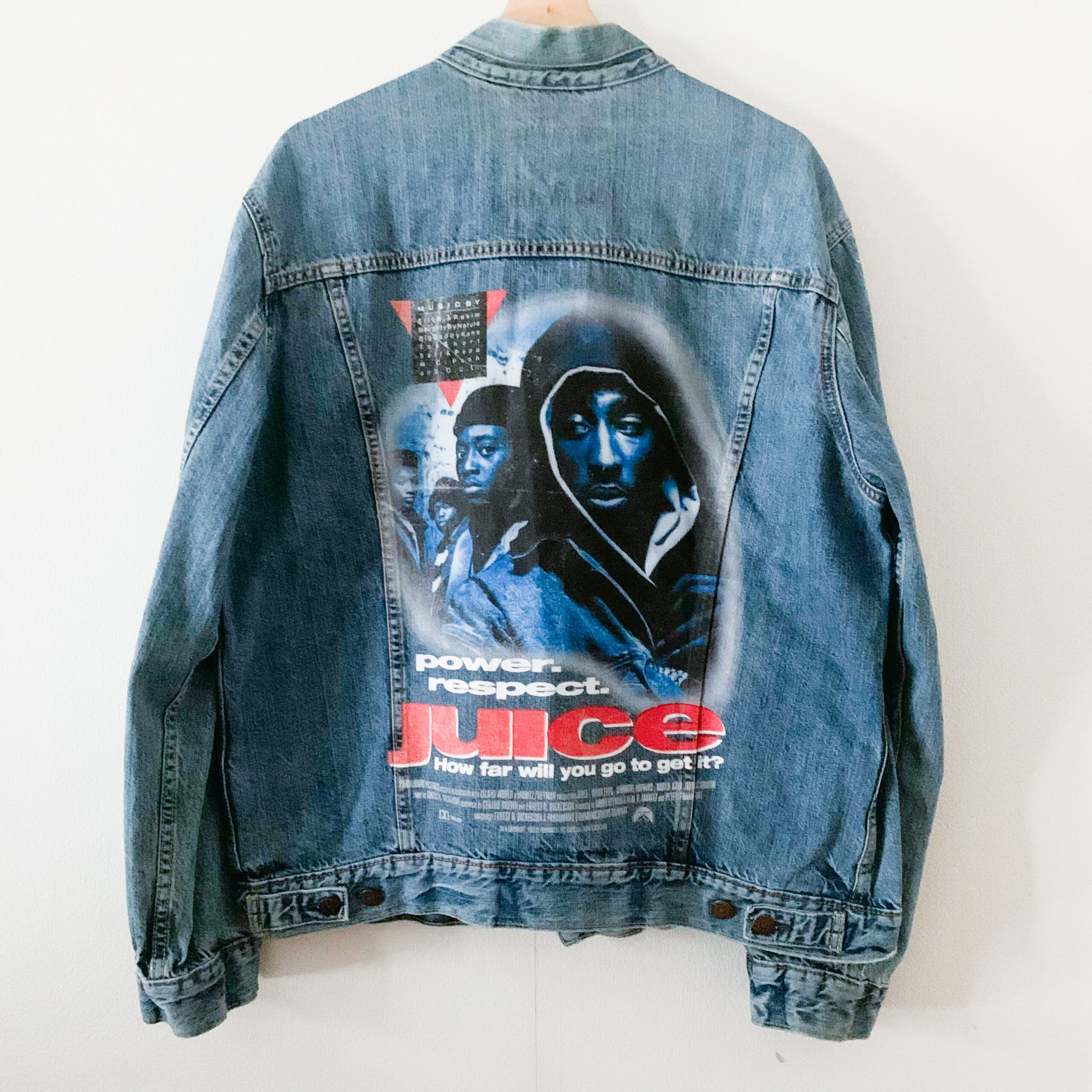 1992年公開、アーネスト・ディッカーソン監督作品『JUICE』。主人公がDJという設定もあり、劇中で流れる曲、そして豪華メンツ参加/名曲揃いのサントラ(特に主題歌となったEric B.& Rakim “JUICE (Know The Ledge)”は秀逸)も含め、多くのアーティスト/DJ達に影響を与えた映画です。今回、初の試みとなるLEVI’SのUSED TRUCKER JACKET(TYPE III)の背面に直接プリントを施しました。USEDならではのONE AND ONLYな、人と被らないアイテムをぜひ。